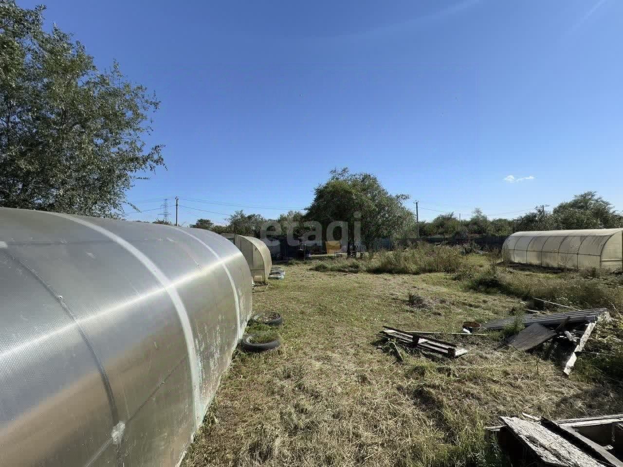 На участке есть 3 хорошие теплицы из поликарбоната, а так же оборудованный ''вагончик'' для отдыха рабочих во время строительства будущего дома.