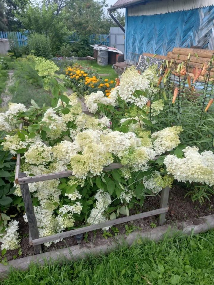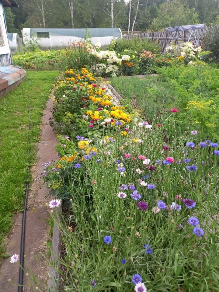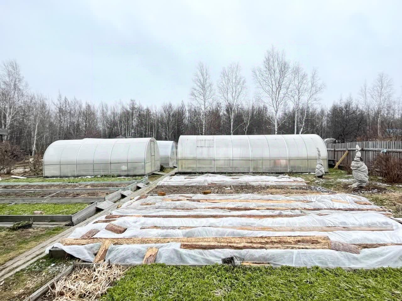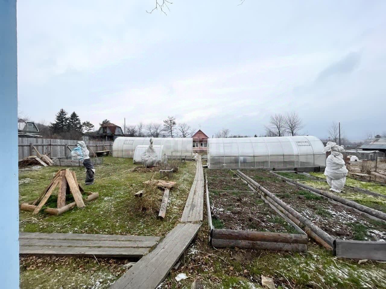 На участке различные многолетние посадки: малина, облепиха, жимолость, смородина красная, черная, белая, калина, вишня, рябина, яблоня, груша, абрикос, слива, клубника. Все укутано и готово к зимовке. Все грядки аккуратно огорожены деревом, дорожки из деревянного настила. Заготовлен перегной на следующий год.